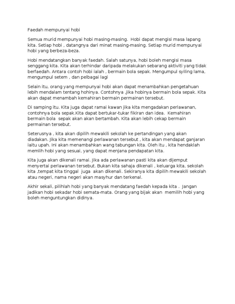 Karangan - Faedah-Faedah Bersenam. Faedah mempunyai hobi Semua murid mempunyai hobi masing-masing. Tulis kebaikan hobi yang kamu gemari.